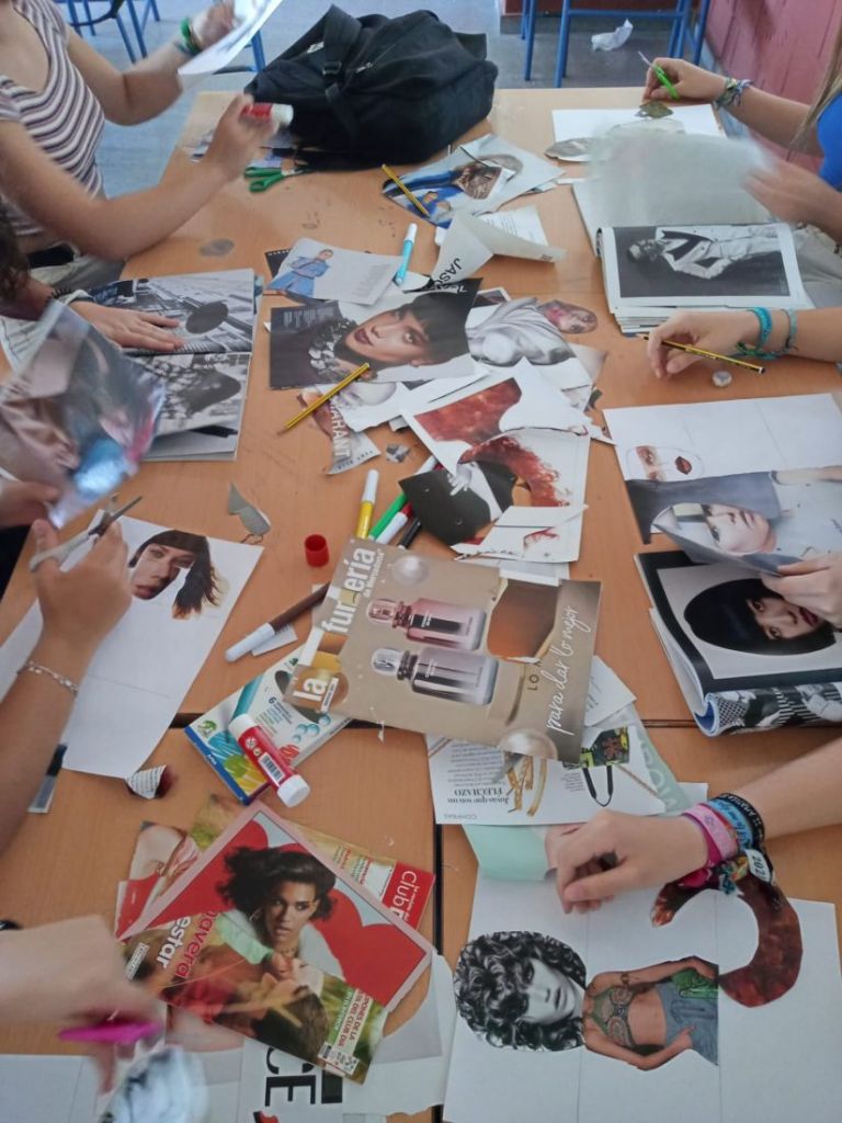 El alumnado de los tres IES participantes se quedó bastante mosca después de haberles presentado qué era un fanzine. No entendían muy bien cómo iban a poder hacer una «revistilla» que tratara sobre el colectivo LGTBI y la equidad de género. Tanto Nuria (servicio externo) como Farmamundi no quisimos guiar en exceso, así que comenzamos por una indicación clara: componer una figura humana a través de dibujos y recortes de revistas para que después pudieran decirnos «te presento a…».